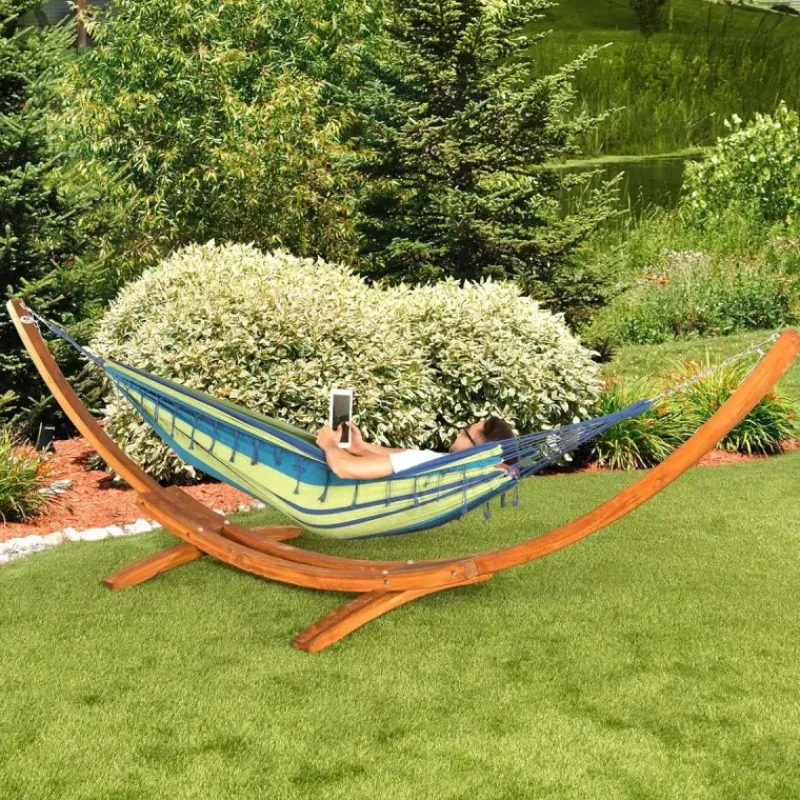 Résistant aux intempéries et aux UV, ce hamac conserve ses qualités dans le temps. Un simple nettoyage à l’eau savonneuse suffit pour le maintenir en parfait état. Léger et maniable, il est conçu pour accompagner vos moments de détente pendant de nombreuses saisons.