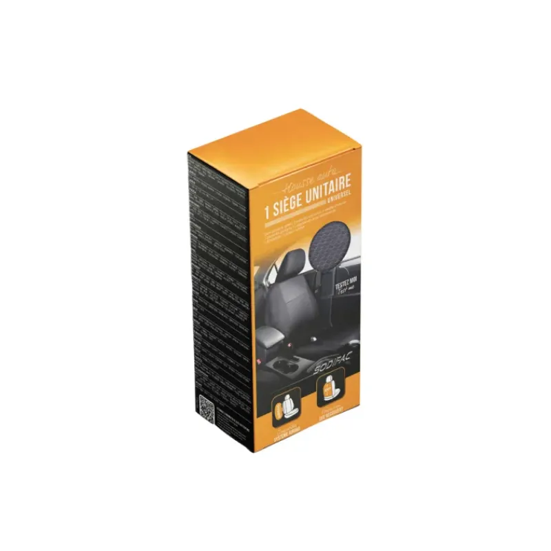 La housse se compose de deux parties distinctes: une protection complète pour l’assise et le dossier du siège avant, accompagnée d’un appui-tête assorti.