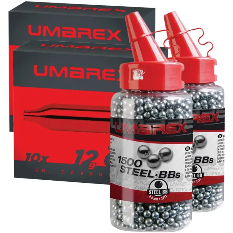 Optimisez vos séances de tir avec le Kit CO² BBs UMAREX®, composé de deux boîtes de 10 cartouches de CO² de 12g et de deux biberons contenant chacun 1500 billes d’acier BBs de calibre 4,5 mm.