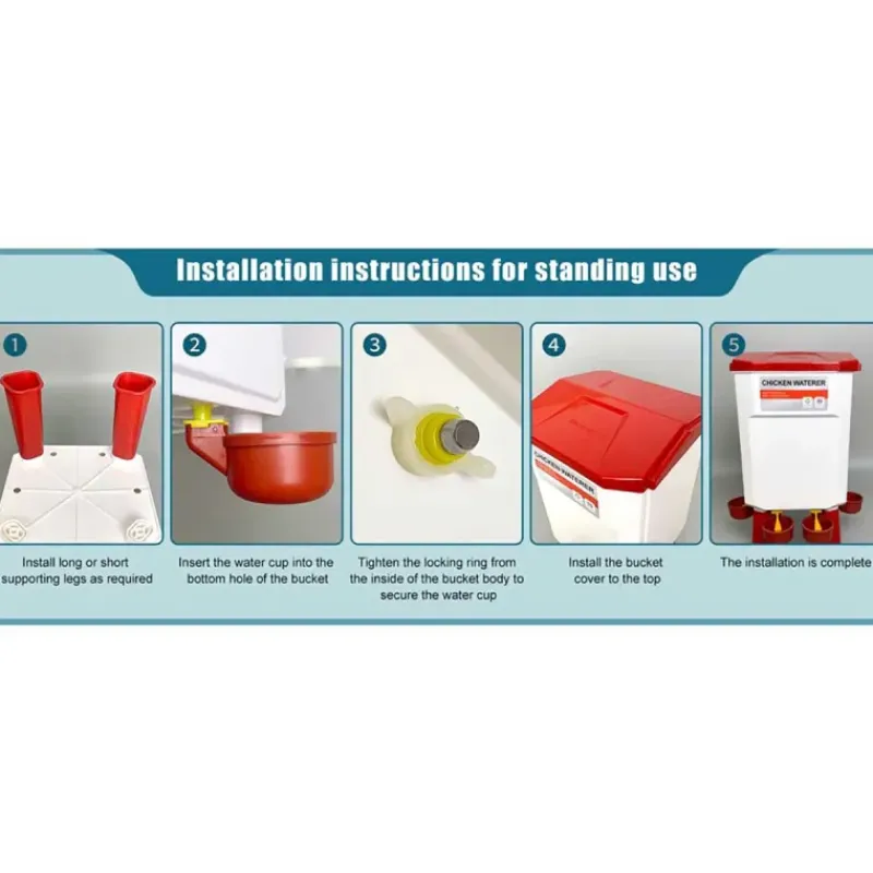Mangeoire 12 kg : 32 x 25 x 44 cm. Abreuvoir 11 L : 25 x 25 x 44 cm, équipé d’une vanne à flotteur pour une régulation optimale de l’eau.