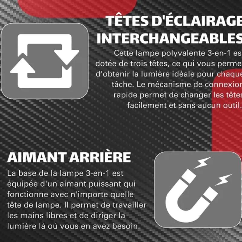 Cette lampe polyvalente combine trois fonctions essentielles : une torche puissante (jusqu’à 1000 Lumens), une barre d’inspection (jusqu’à 600 Lumens) et une tête flexible (jusqu’à 200 Lumens). Idéale pour les professionnels et les bricoleurs, elle s’adapte à toutes les situations grâce à ses têtes interchangeables.