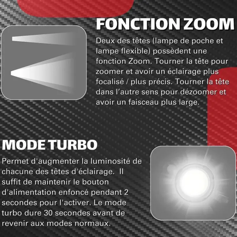 - Puissance : 1000 Lumens (torche), 600 Lumens (barre d’inspection), 200 Lumens (tête flexible)