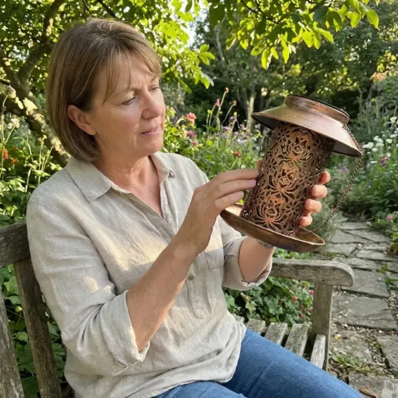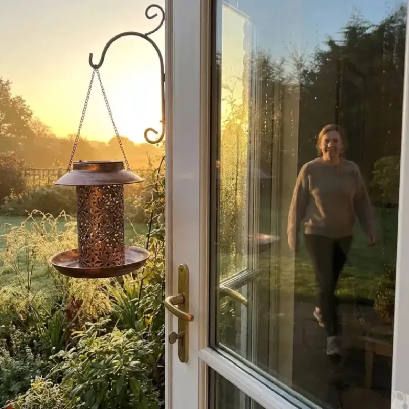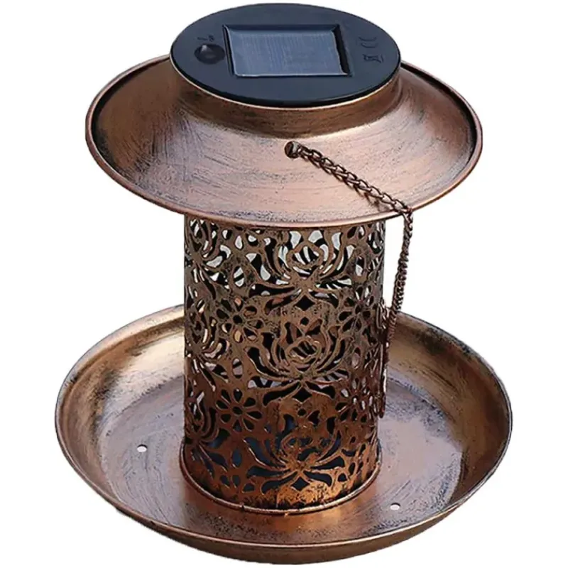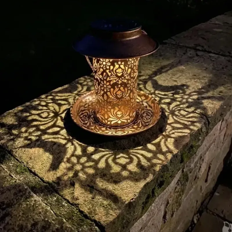 Les découpes en forme d’arabesques sur le réservoir permettent aux oiseaux de picorer des graines à la nuit tombée, créant ainsi de magnifiques projections lumineuses autour de la lanterne.