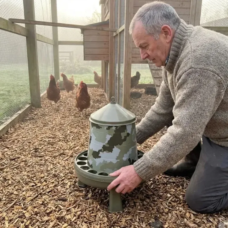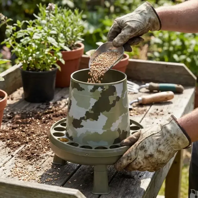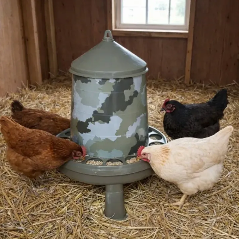Offrez à vos volailles une alimentation propre, accessible et bien distribuée grâce à la mangeoire 4 kg camo.