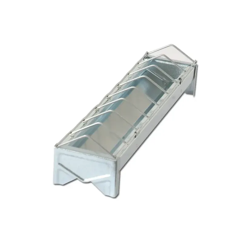 Cette mangeoire pour la volaille, entièrement galvanisée, évite le gaspillage de nourriture.