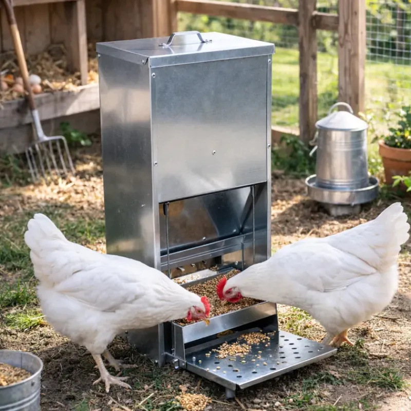 En se plaçant sur la pédale de la mangeoire, le mécanisme d’ouverture s’active, ce qui permet à vos poules de se nourrir.