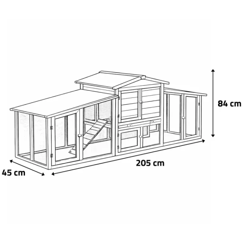 Avec des dimensions de 205 x 45 x 84 cm, ce poulailler offre un espace généreux tout en restant compact pour s’adapter à la plupart des jardins.