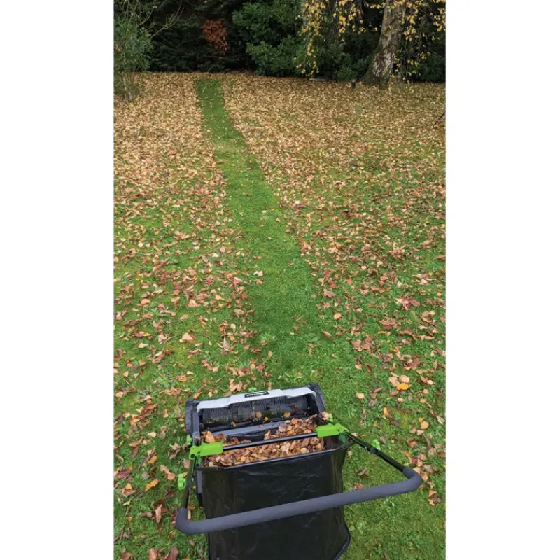 Le bac de ramassage de 100 litres offre une capacité importante, réduisant les interruptions pour vidage et permettant de traiter de grandes surfaces d’un trait.