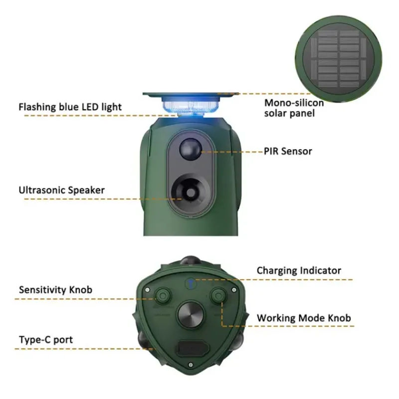 Ce répulsif électronique utilise une combinaison d’ultrasons (13,5 – 45 KHz), d’une alarme sonore (90-120 Db) et de flashs lumineux pour éloigner efficacement les nuisibles. Idéal pour protéger votre jardin, terrasse ou espace extérieur sans recourir à des méthodes chimiques.