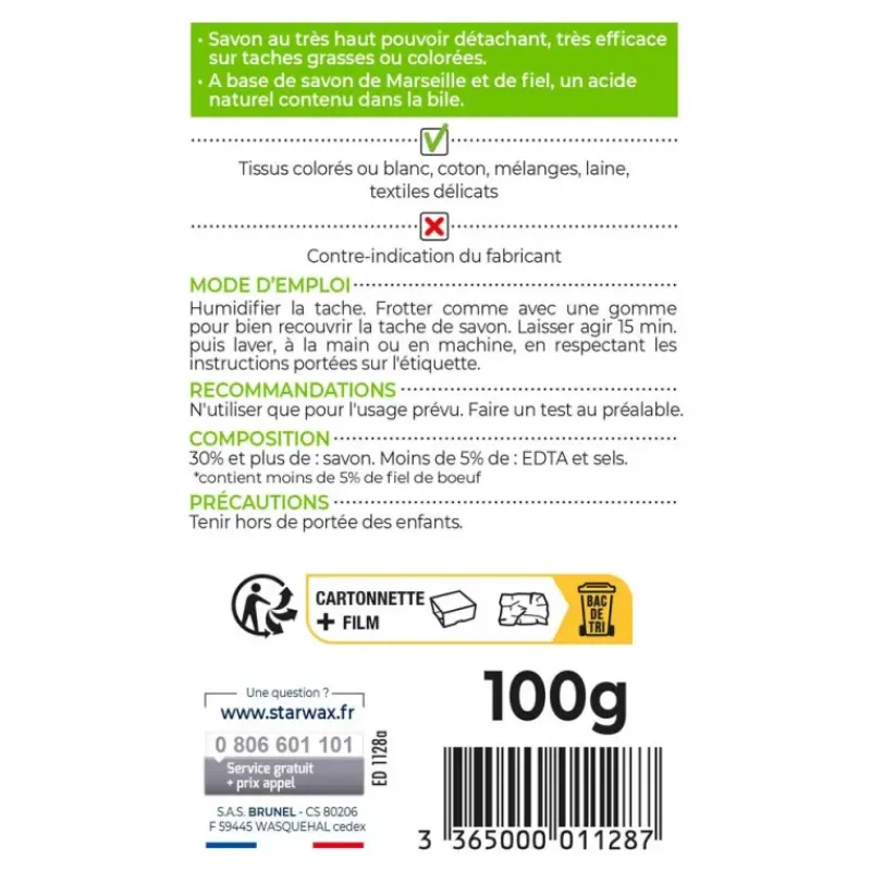 Savon détachant fiel de bœuf textile 99,9% naturel Contenance 100g Starwax