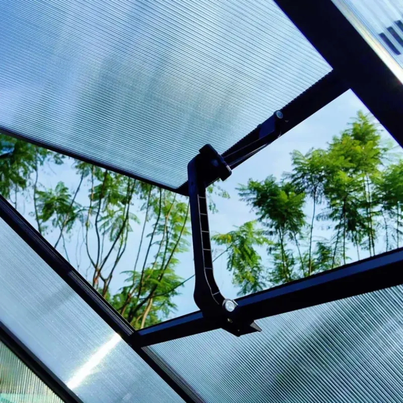Les parois en polycarbonate transparent de 4 mm d’épaisseur, à double paroi et creux, assurent une excellente isolation thermique. La protection UV intégrée préserve vos cultures des rayons nocifs tout en permettant une diffusion homogène de la lumière.