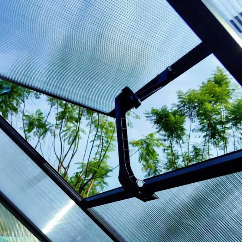 Les parois de cette serre sont fabriquées en polycarbonate transparent de 4 mm d’épaisseur, à double paroi et creux, offrant une excellente isolation thermique. Dotées d’une protection UV intégrée, elles préservent vos cultures des rayons nocifs tout en laissant passer la lumière nécessaire à leur croissance.