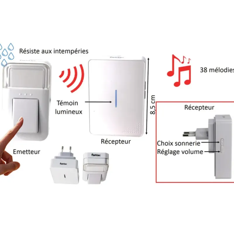 - Pas de fil entre le bouton transmetteur et le boîtier receveur
