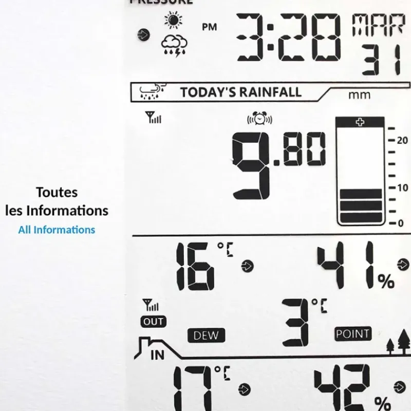 Le pluviomètre inclus mesure avec précision le niveau des précipitations et déclenche une alerte en cas de pluie imminente. Parfait pour les jardiniers, agriculteurs ou toute personne souhaitant surveiller les intempéries.