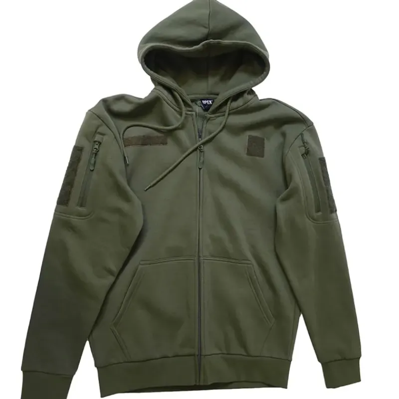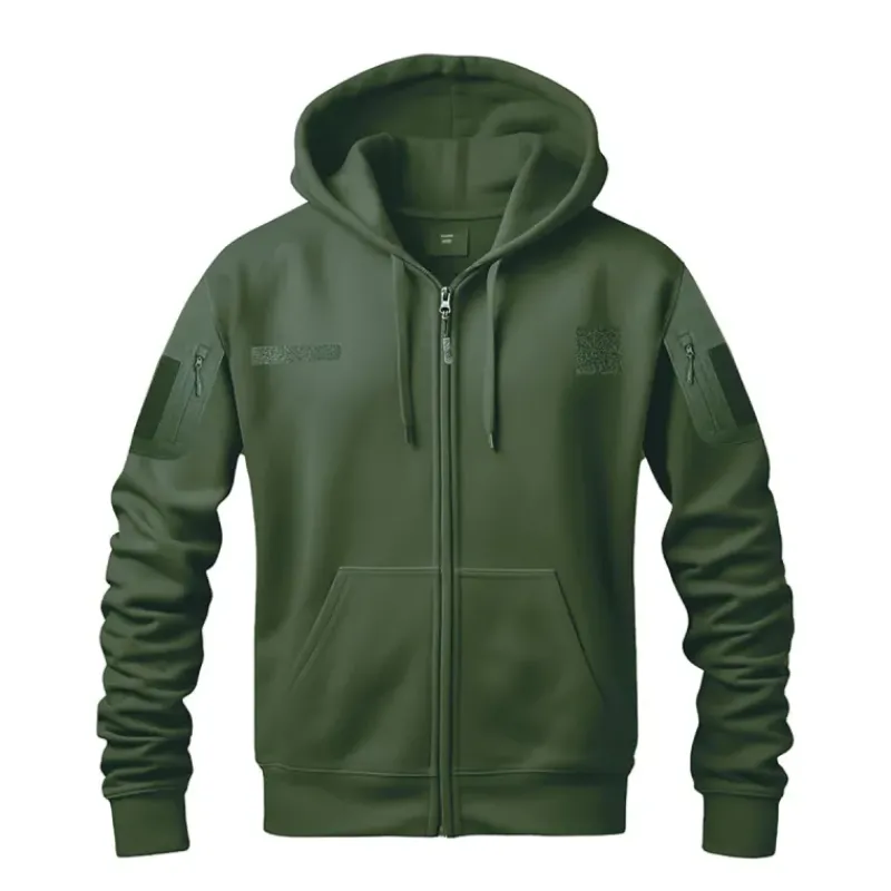 Ce sweat à manches longues arbore un col rond et une capuche pour une protection optimale. Son style militaire est renforcé par des 2 poches ventrales et 2 poches zippées sur les bras, idéales pour ranger vos essentiels en toute sécurité. La fermeture zippée intégrale permet un enfilage facile et un ajustement personnalisable.