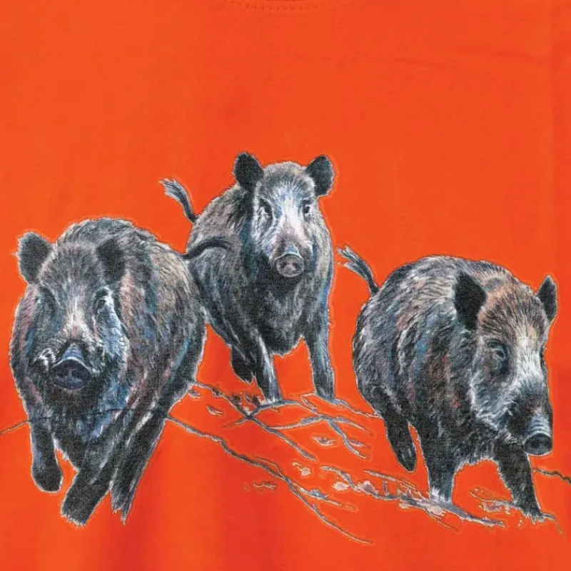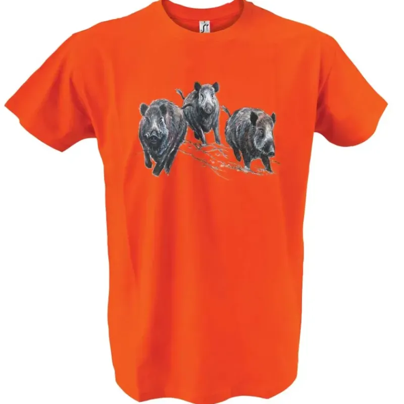 Ce t-shirt met en avant une scène de chasse, avec trois sangliers courants magnifiquement sérigraphiés.