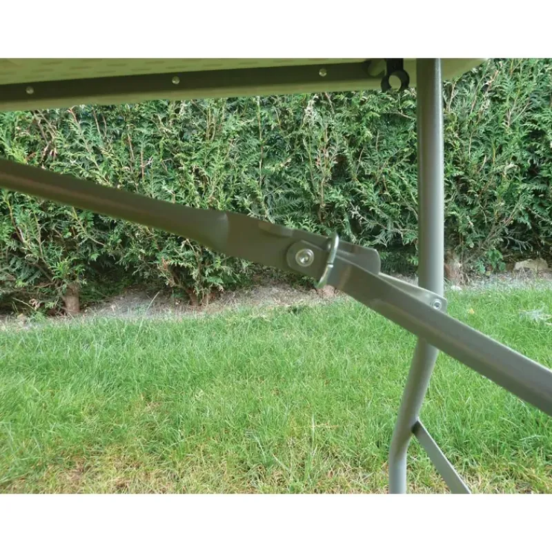 Verrouillage des pieds par bague coulissante et verrouillage du plateau par loquet sécurisé.